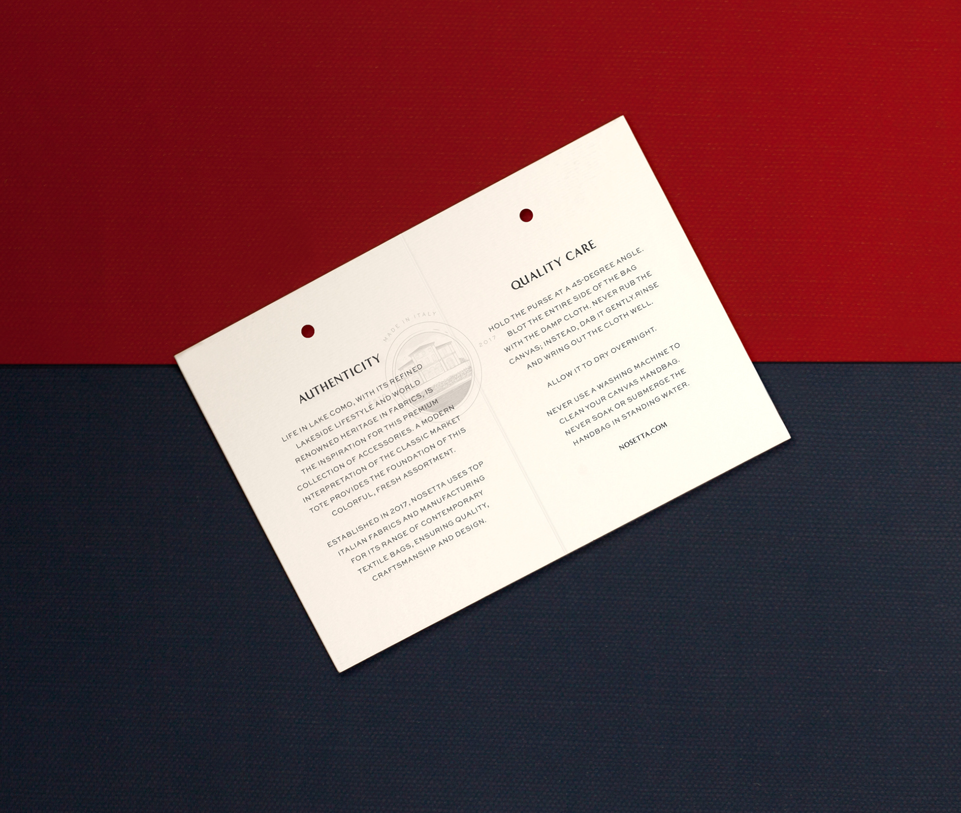 Directives when creating the branding for Nosetta included words such as authenticity, sophistication, contemporary but timeless. This was achieved through the purposeful pairing of fonts to create a wordmark that would evoke the desired feelings set forth by the client. An authenticity stamp was created and used subtly throughout the branding to give a indication of a bona fide and artisanal product. The art direction for the photography was envisioned to contrast the bright, solid canvas materials set against natural environments.